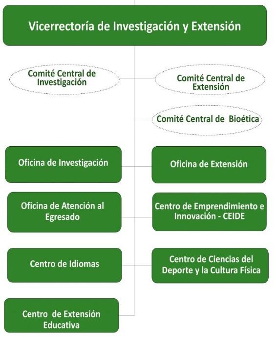 La estructura orgánica de la Vicerrectoría de Investigación y Extensión (VIE) actúa como ente rector de las políticas de investigación, innovación y extensión universitaria.